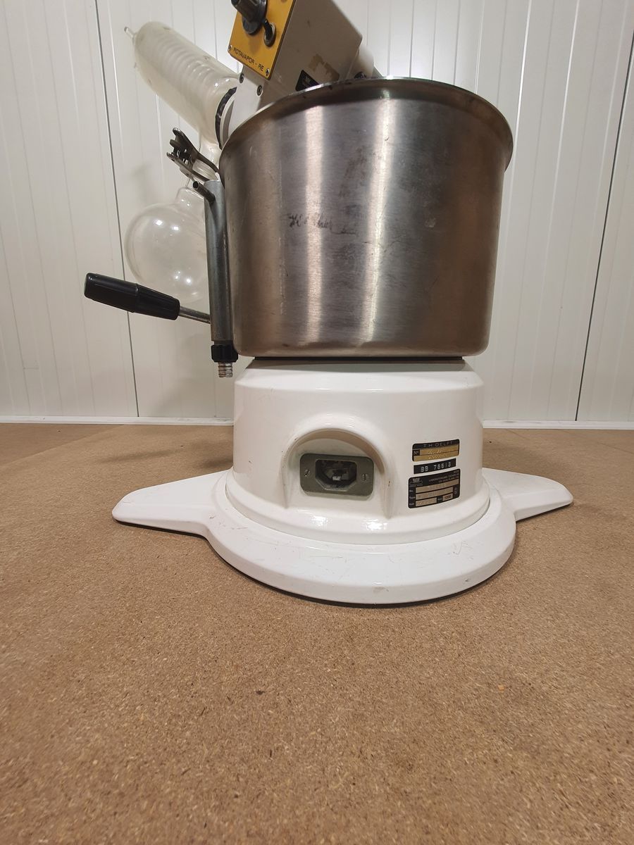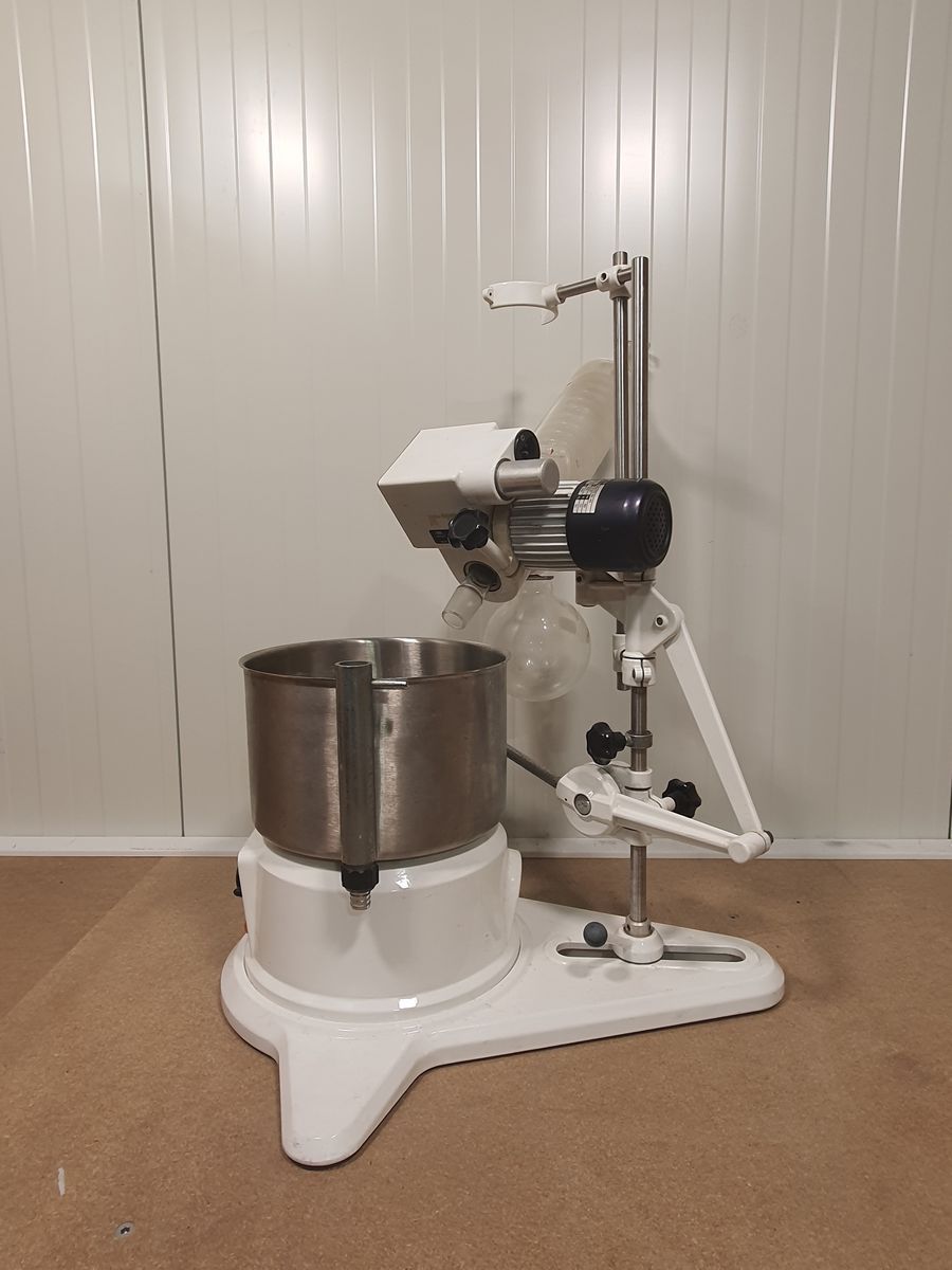 This is a classic Büchi Rotavapor® rotary evaporator system consisting of the KRvrTD 65/45 evaporator head, motor and stand, paired with a Büchi CH-9230 heating bath and complete glassware. Rotary evaporators like this are used to gently remove solvents from samples under vacuum, a staple in organic chemistry labs, pharmaceutical R&D, natural product isolation, and chemical synthesis.
